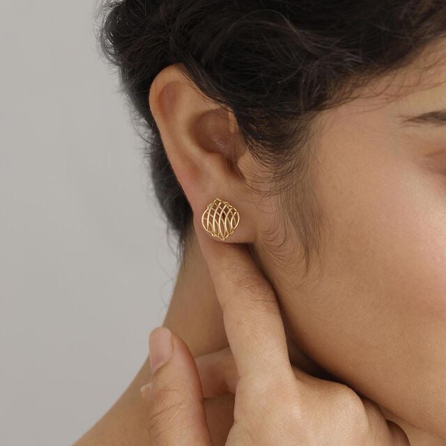 The bold studs feature a modern lattice pattern in 14 KT gold, adding an edgy twist to your sangeet and cocktail #OOTDs. Their sleek finish ensures that they’ll stay put even as you burst out your favourite dance moves. At the same time, their bold style shall make you shine like the Belle of the Ball!