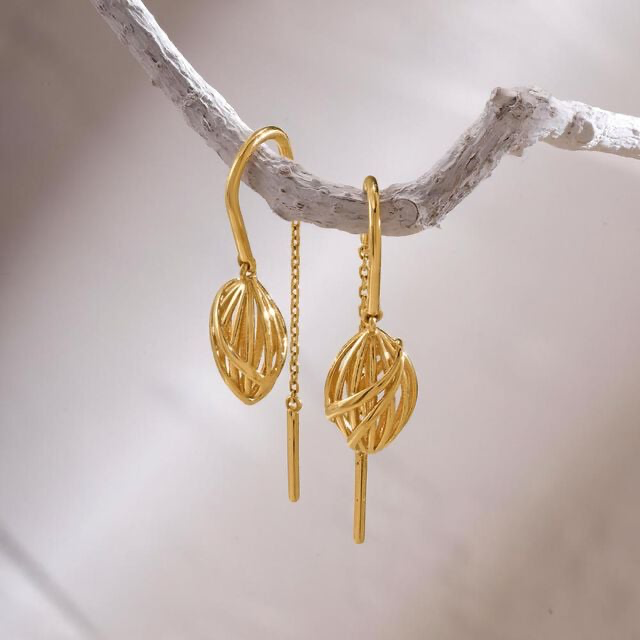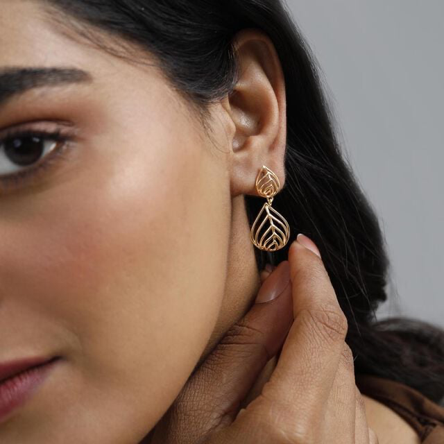 Are you particularly shopping for your Haldi ceremony, which is being held on the morning of your wedding day? Match the vibrant hues of your Haldi lehenga by self-gifting an elegant pair of gold drop earrings featuring intricate, veiny details. It shall add a touch of contemporary, whimsical twist to your traditional look.